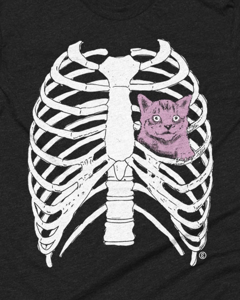 Wear your heart on your sleeve… or better yet, inside your ribcage. This playful tee features a bold ribcage graphic with a sweet pink kitty tucked safely inside—because let’s be honest, cats live rent-free in our hearts.